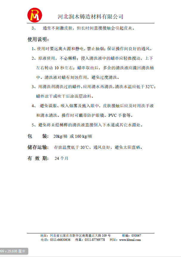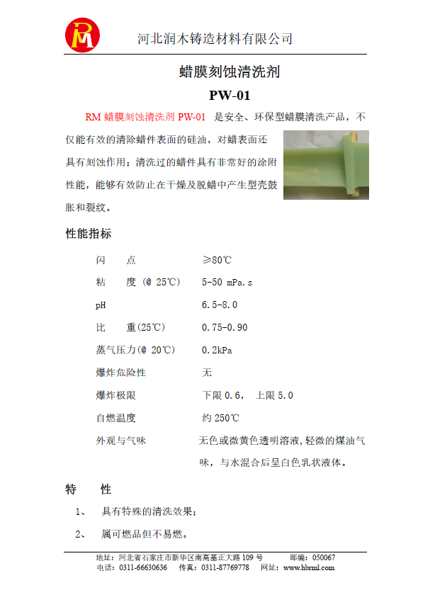 RM蠟?zāi)た涛g清洗劑PW-01 是安全、環(huán)保型蠟?zāi)で逑串a(chǎn)品,不僅能有效的清除蠟件表面的硅油,對(duì)蠟表面還 具有刻蝕作用;清洗過(guò)的蠟件具有非常好的涂附性能,能夠有效防止在干燥及脫蠟中產(chǎn)生型殼鼓脹和裂紋。